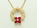 艶やかなゴールドの円形の枠下部に、照りのある良質ルビー4石、真ん中に良質ダイヤ1石を花のようにセット、まわりのゴールドの部分にも良質メレダイヤ41石をあしらったキュートなデザインペンダントです♪♪