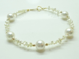 金具は、K18で、良質アコヤ真珠と淡水真珠、ゴールドのミラーボールの入ったデザインで、とてもキュートなブレスレットです。